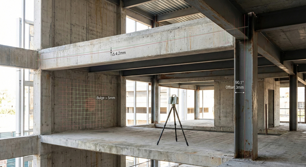 Detect and quantify beam sagging, column leaning, or wall bulging to assess structural integrity.